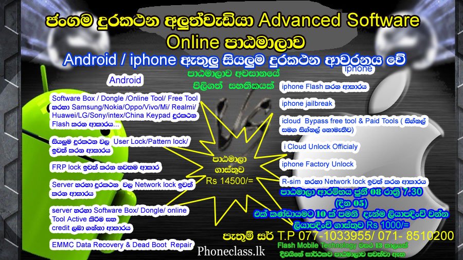 👉 Software box / Software Dongle /Online tool / Free tool හරහා Samsung /Nokia / Oppo /vivo /Mi /Realmi /Huawei/LG /Sony /Intex / China keypad දුරකථන ඇතුළු සියලුම දුරකථන flash කරන ආකාරය
